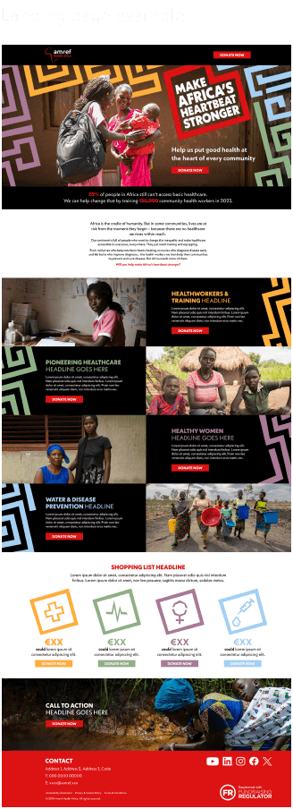 Here you can see the template for the main donor landing page, with a clear format and design example to follow. It gives an overview of the four areas of work and uses the Make Africa’s Heartbeat Stronger visual lock-up.