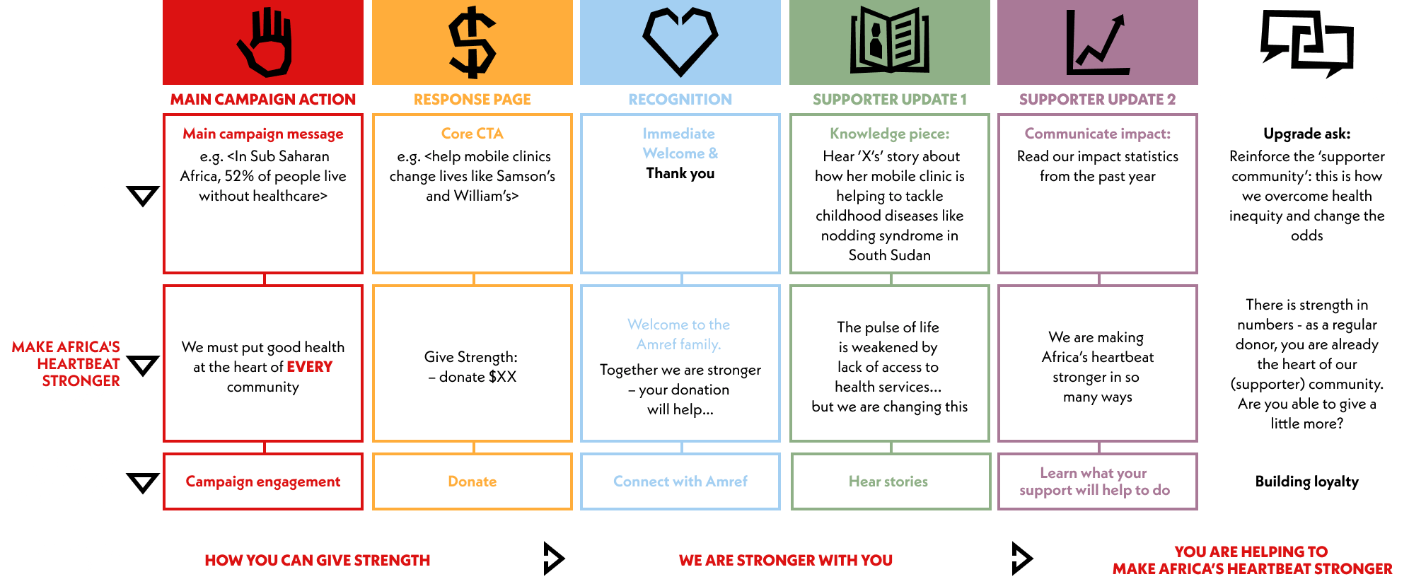 We’ve mapped out an outline messaging structure for new supporters from first seeing a fundraising campaign piece to roughly the end of the first 6 months, to provide you with direction on ways to keep communicating the Make Africa’s Heartbeat Stronger narrative at key stages. These are example messages, and are suggestions to help inspire you put together your own messaging structures. The specific details can be adapted based on the topic of campaign they are first recruited by.
